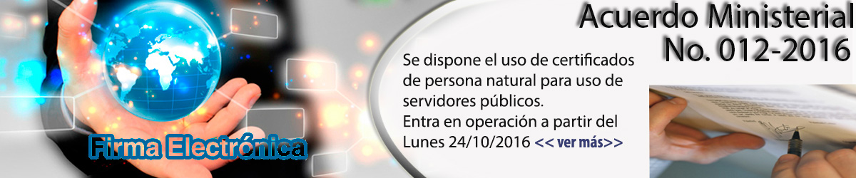 Mediante Acuerdo Ministerial No.012-2016, se dispuso la eliminación de certificados de firma electrónica de funcionario público. Por tal motivo a partir del día lunes 24 de octubre de 2016 ya no se emitirán certificados de dicho tipo, en su lugar se deberá solicitar certificados de persona natural para todos los operadores de justicia a nivel nacional y resto de servidores públicos a excepción de los servidores judiciales y públicos que requieran para facturación electrónica en donde deberán solicitar certificados de miembro de empresa.